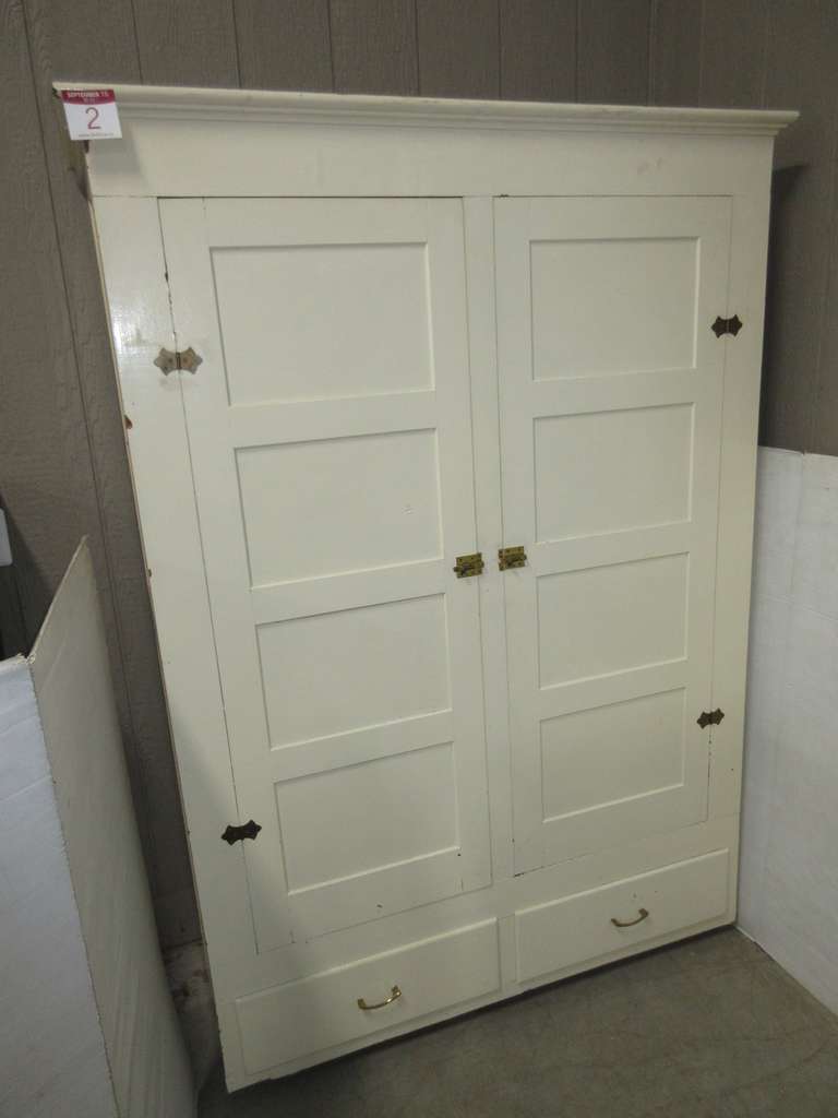 Albrecht Auctions Old Farmhouse Cabinet Storage Box With Two Cabinet Doors And Two Drawers Inside Has Four Shelves On Left And Open Space On Right All On Casters Was Painted Cream Color