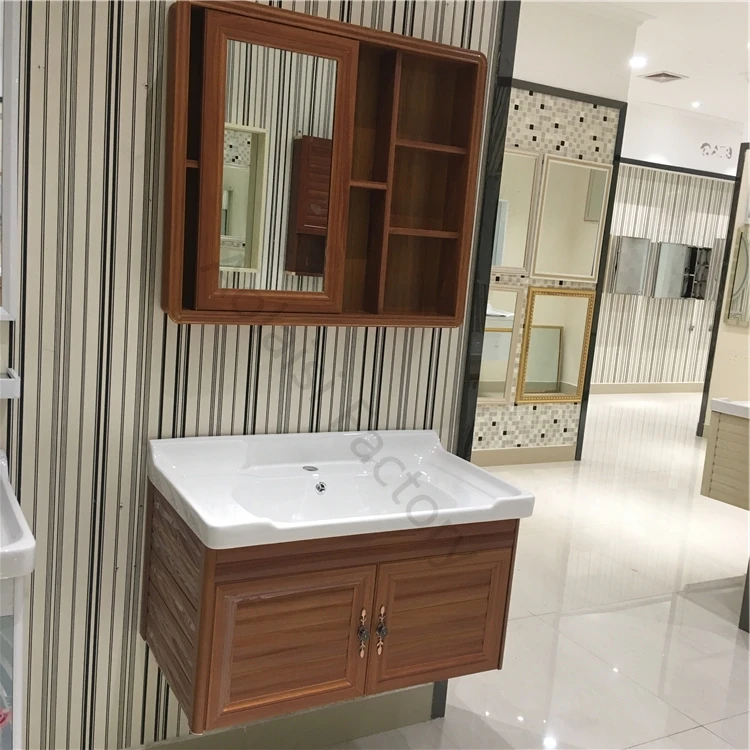 China Europe Style Bathroom Cabinet Set Modern Wash Basin Wall Mounted Aluminum Wood Grain Cabinet With Mirror For India China Wood Grain Color Bathroom Cabinet Aluminum With Wood